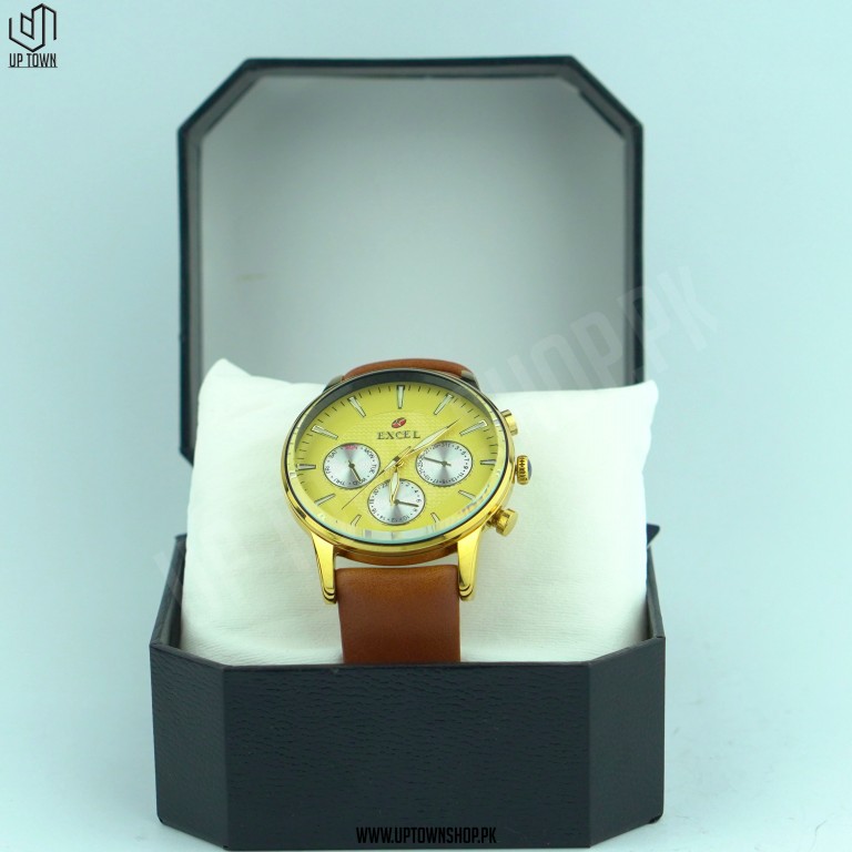 Excel Gold Class Edition EX-5088 Crystal Glass Brown Strap Watch