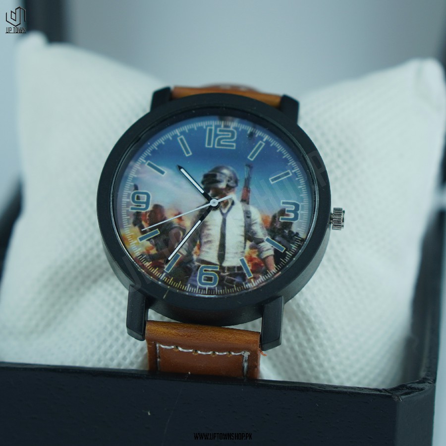 Game-Inspired Style: PUBG Dial Brown Strap Watch. Elevate Your Look with Unique Charm. Shop Now for a Trendy and Playful Accessory
